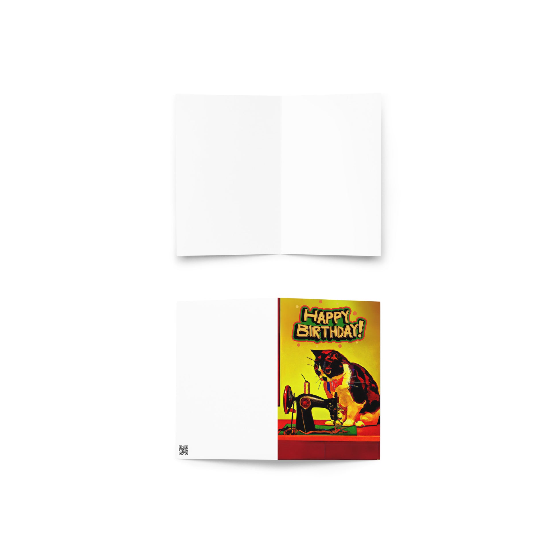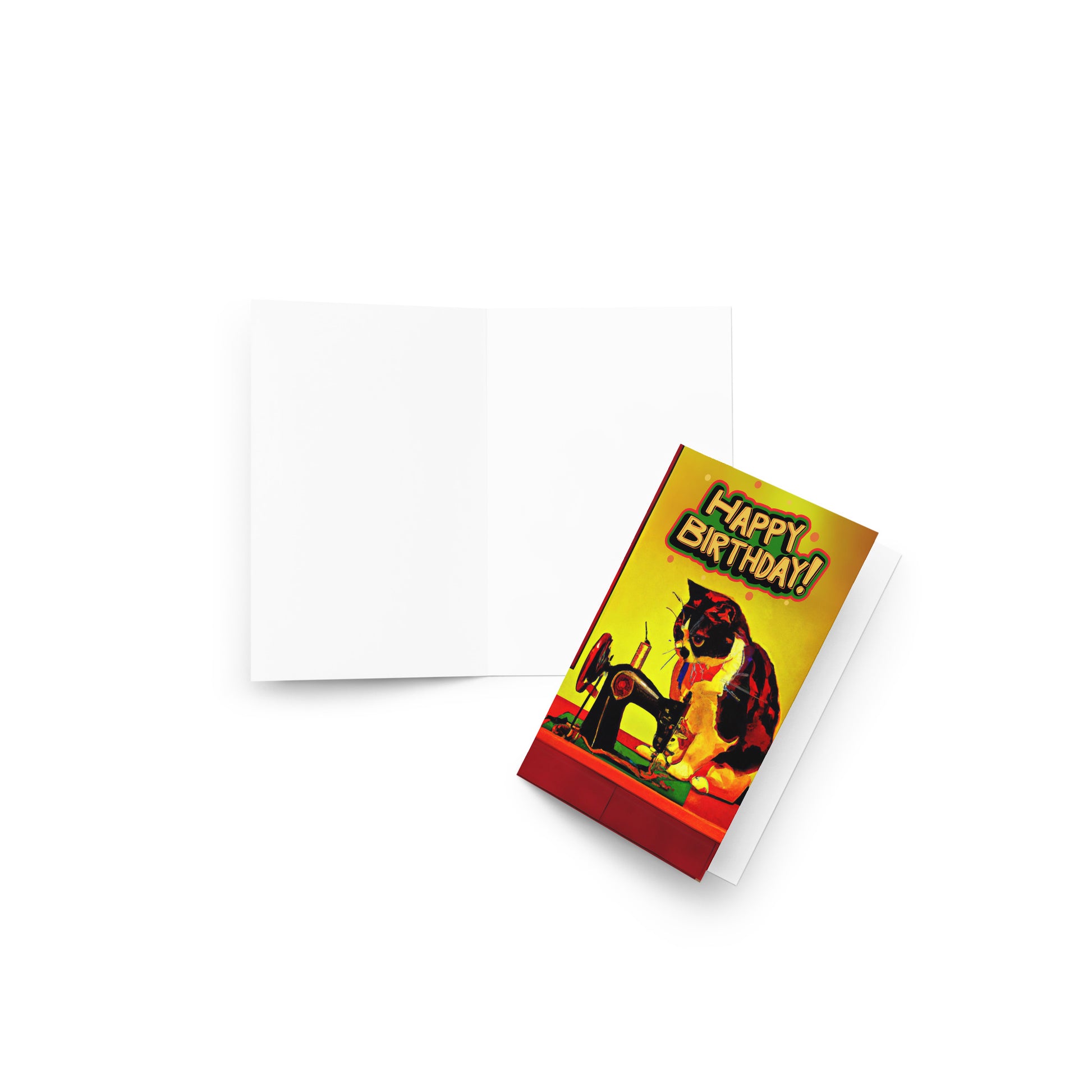 This birthday card celebrates the art of sewing and cats, so it's just purrfect for cat lovers and sewing enthusiasts alike.