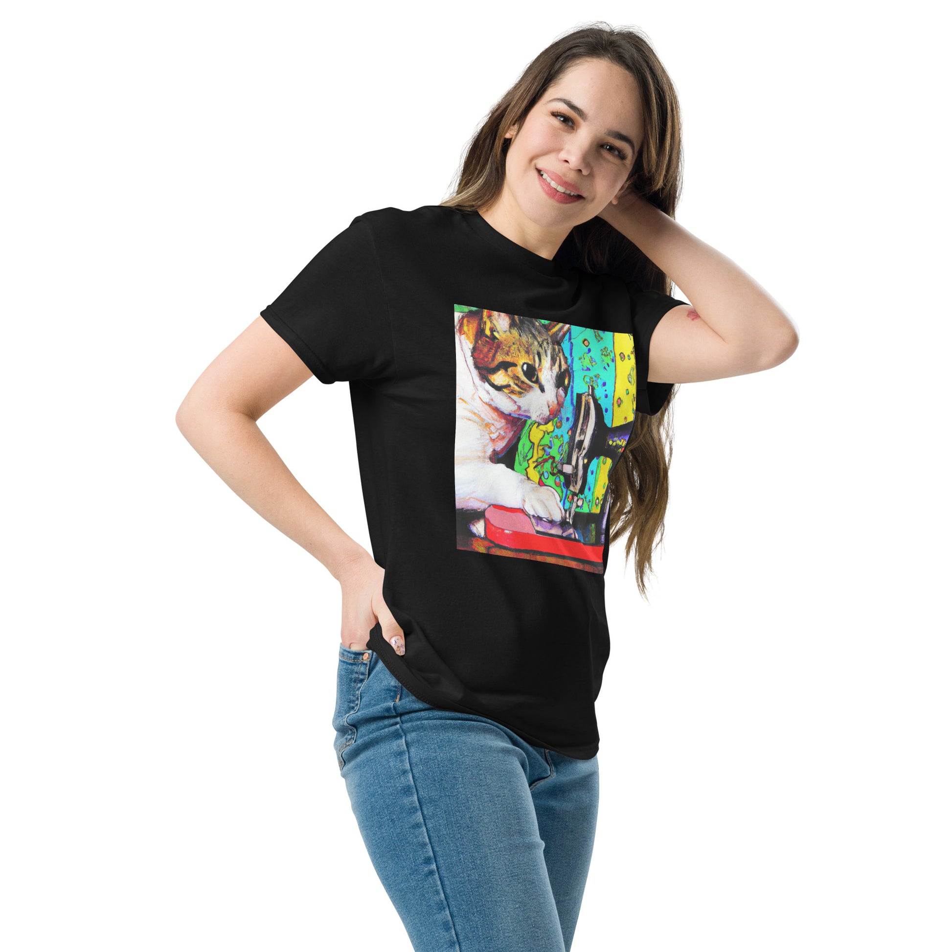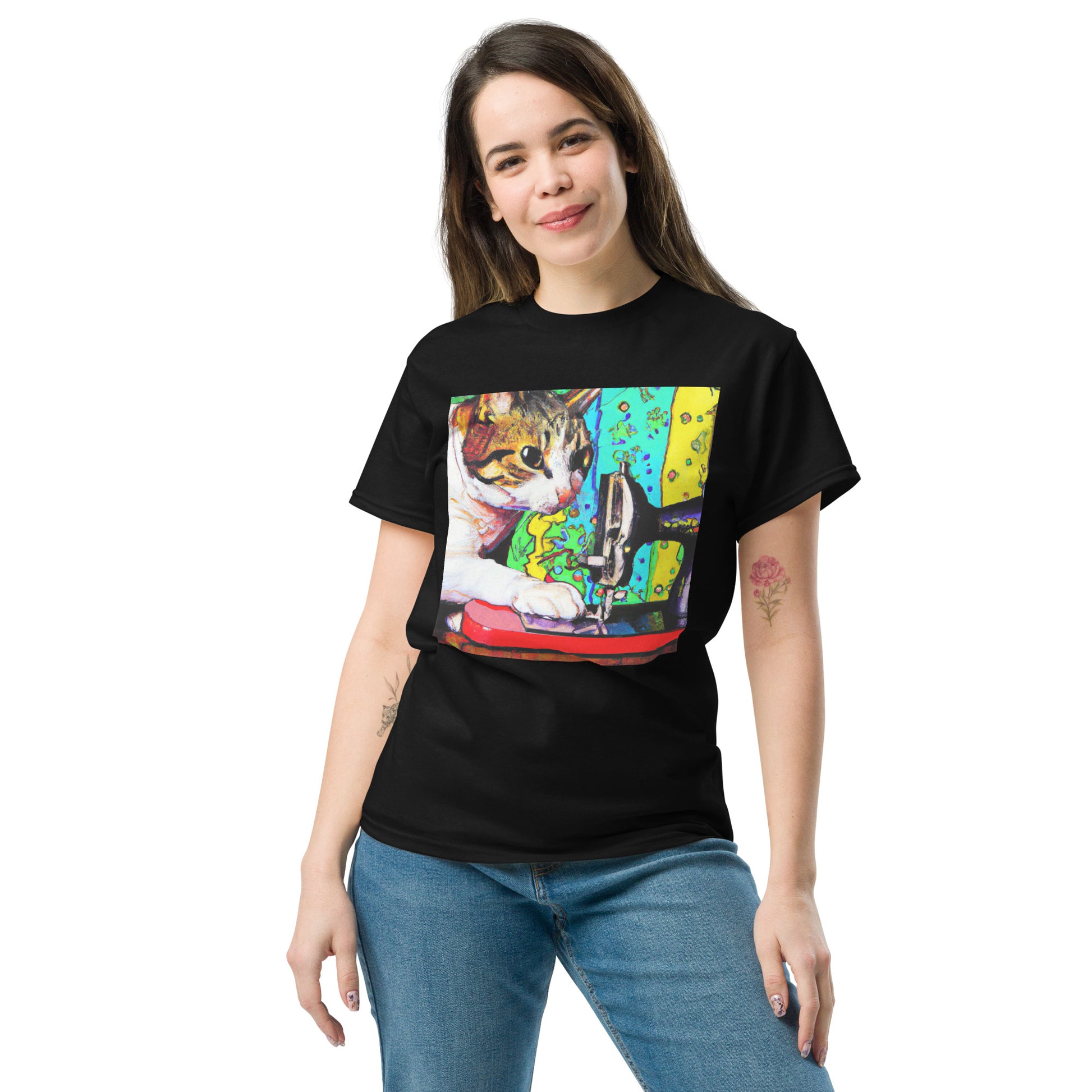 Elevate your casual wardrobe with our exclusive 100% cotton t-shirt featuring a unique graphic. This design celebrates the art of sewing and the charm of cats, making it a must-have for cat lovers and sewing enthusiasts alike.